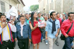 La edil Jeannine Cruz avanzó por la calle Rocafuerte, seguida de simpatizantes y sectores que la apoyan.